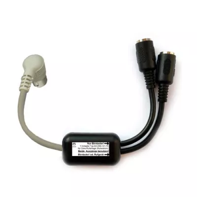 Der Y-Adapter dient zum Anschluss von 2 Mehrfachtastern mit Lichtsteuertasten oder einem anderen Rufgerät (z.B. einem Funkempfänger) auf den 7-pol. Steckanschluss von ACKERMANN-Clino-Systemen.
