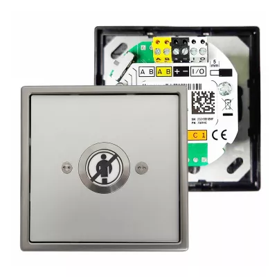 Abstell-Modul mit Frontplatte Jung ES Mit integrierter SCU (73091C) zum Anschluss via DBUS Hinweis: Die Anwesenheits-Lampe dieses Moduls ist ohne Funktion, sie ist daher nur zur Rufabstellung geeignet!
